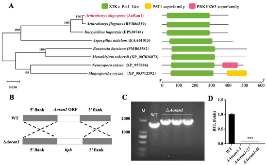 A phylogenetic analysis of AoRan1 and the deletion and verification of the Aoran1 gene in A. oligospora. (A) A neighbor-joining tree of orthologous Ran1 in different fungi, which was built using MEGA7.0 (Left), and a prediction of the functional domains of AoRan1 homologs in diverse fungi (Right). (B) A schematic diagram of the homologous recombination strategy used to knock out Aoran1. (C) The validation of ΔAoran1 transformants using PCR. (D) The validation of ΔAoran1 transformants using RT-qPCR. RTL: the relative transcription level of gene Aoran1. Asterisk: Significantly different compared to the WT strain (*** p < 0.001).