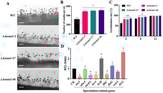 Role of AoRan1 in conidiation. (A) Observations of conidiophores in fungal strains. Bar = 100 μm. (B) Conidial production in 1 μL conidial suspension, comparing WT and mutant strains. (C) Conidial germination rates in fungal strains. (D) Relative transcription level (RTL) of several sporulation-related genes in mutant strain versus WT strain, detected using RT-qPCR. CK was denoted as standard for statistical analysis of relative transcription level of gene in mutant versus WT strain. Asterisk: Significantly different compared to WT strain (* p < 0.05; ** p < 0.01).