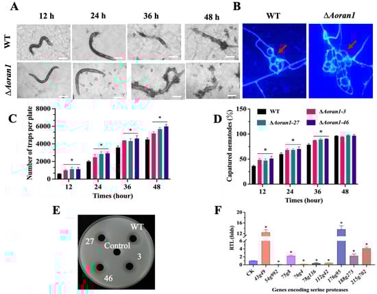 Role of AoRan1 in trap formation, nematode-trapping ability, and proteolytic activity. (A) Microscopic images of trap formation and predation on nematodes at 12–48 h. Bar = 100 μm. (B) Traps were stained with CFW to observe their morphology. Red arrows: traps. Bar = 20 μm. (C) Trap yields of fungal strains at 12–48 h. (D) Percentages of nematodes captured by fungal strains at 12–48 h. (E) Comparison of hydrolysis circle of protease activity between WT and mutant strains. (F) Relative transcription level (RTL) of several genes encoding serine proteases in mutant strains, detected using RT-qPCR. CK was denoted as standard for statistical analysis of relative transcription level of gene in mutant versus WT strain. Asterisk: Significantly different compared to WT strain (* p < 0.05).