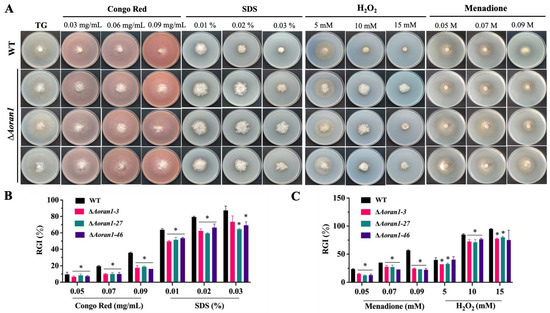 To explore the ability of AoRan1 to respond to external stressors, the fungal strains were incubated in TG solid medium with different concentration gradients of chemical stress reagents, including oxidants (H2O2 and menadione), osmotic stressors (NaCl and sorbitol), and cell wall synthesis-disturbing reagents (SDS and Congo red) for 5 days under dark conditions. TG medium without any added reagents was used as a control. The relative growth inhibition (RGI) values were calculated as previously described [34,37]. Three biological replications were performed for each sample.