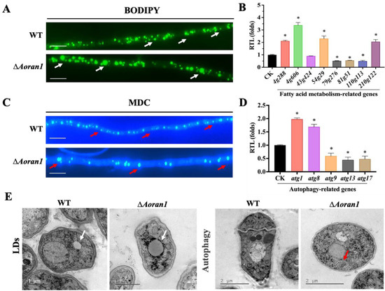 BODIPY staining showed a significant increase in LD accumulation in the ΔAoran1 mutant strains compared with the WT strain (Figure 6A). The transcription levels of eight genes related to LD metabolism were examined via RT-qPCR, among which the transcription levels of genes encoding short-chain dehydrogenase reductase (AOL_s00004g288), peroxisomal ABC transporter (AOL_s00004g606), peroxisomal hydratase-dehydrogenase-epimerase (AOL_s00054g29), and 3-ketoacyl-CoA ketothiolase (AOL_s00210g122) were significantly upregulated, and the transcription levels of acyl-CoA dehydrogenase (AOL_s00079g276), phosphatidylinositol transfer protein (AOL_s00081g51), and 3-hydroxybutyryl-CoA dehydrogenase (AOL_s00110g113) were considerably downregulated (Figure 6B). MDC staining showed a remarkable decrease in the number but an increase in the volume of autophagosomes (Figure 6C). Among the six autophagy-related genes examined, the transcription levels of atg1 and atg8 were significantly upregulated, and the transcription levels of atg9, atg13, and atg17 were significantly downregulated (Figure 6D). In addition, the TEM images show more significant LD accumulation and autophagic levels in the ΔAoran1 mutant strains than in the WT strain (Figure 6E).