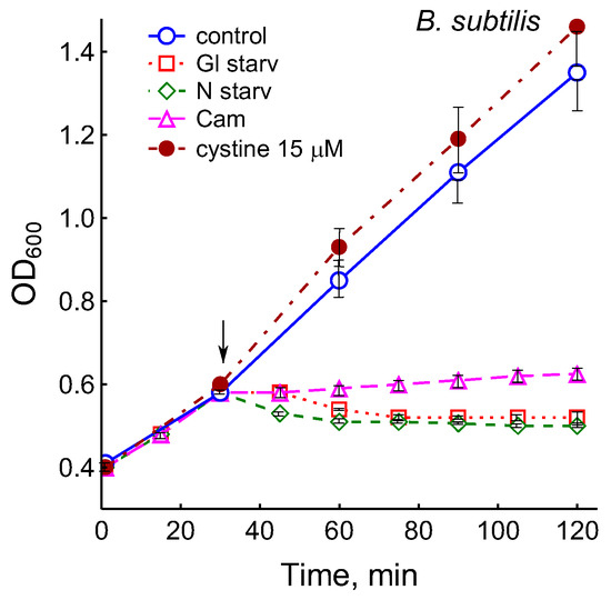 3.3. Response of B. subtilis to the Addition of Cystine