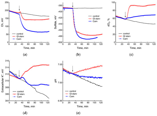 Changes in platinum (a) or sulfide-selective (b) electrode potential, dissolved oxygen (dO2) level (c), potassium-selective electrode potential (d), and pH (e) in B. subtilis in response to glucose depletion or the addition of chloramphenicol (25 µg mL−1). The arrows indicate the time of CAM addition or the onset of glucose starvation.