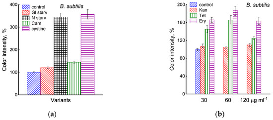 The treatment of growing B. subtilis with 25 μg mL−1 chloramphenicol caused a rapid cessation of growth (Figure 1) and an irreversible decrease in the potential of Eh and sulfide sensors (Figure 2a,b). The largest deviation from the baseline was 108 ± 3 mV, which corresponded to 1.35 µM sulfide (Figure 2b). The Pb(Ac)2 strip test also showed an increase in the H2S content over the culture medium after the addition of Cam. Besides chloramphenicol, H2S excretion in B. subtilis was induced by erythromycin, kanamycin, and tetracycline (Figure 3a,b and Figure S3). H2S excretion was previously observed by us when E. coli, growing on M9 medium with glucose, was treated with several antibiotics, including chloramphenicol (Cam) and tetracycline (Tet) [2].