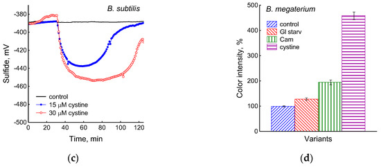 The comparison of the profiles of changes in the potentials of the platinum and S2−-selective electrodes (Figure 2a,b) indicates that, as in E. coli [2], changes in Eh during glucose starvation in B. subtilis are also associated with sulfide leakage. At the same time, unlike E. coli, in B. subtilis the excretion of sulfide upon glucose depletion is irreversible. In both bacteria, under normal growth conditions (control) extracellular sulfide is not detected by either of the methods used.