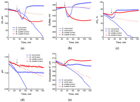 Changes in platinum (a) or sulfide-selective (b) electrode potential, dissolved oxygen (dO2) level (c), pH (d), and potassium-selective electrode potential (e) in the response of B. subtilis and E. coli to ammonium depletion. The arrows indicate the time of the onset of ammonium starvation.