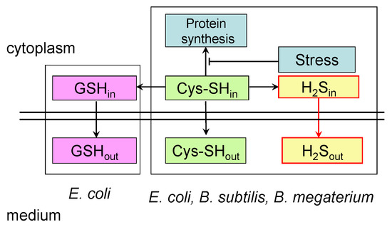 Proposed scheme of stress-induced excretion of low-molecular-weight thiols by Bacillus and E. coli. The stress-induced inhibition of protein synthesis leads to an increase in intracellular cysteine pools. In B. subtilis, B. megaterium, and E. coli, to restore cysteine homeostasis, one part of it is excreted into the medium, and the other part undergoes desulfurization with the formation of hydrogen sulfide, which diffuses into the medium. In E. coli, part of the cysteine is also incorporated into glutathione. It is assumed that this is the reason for the increased production of stress-induced sulfide in Bacillus compared to E. coli. GSHin and GSHout are intra- and extracellular glutathione pools; Cys-SHin and Cys-SHout are intra- and extracellular cysteine pools; H2Sin and H2Sout are intra- and extracellular hydrogen sulfide.