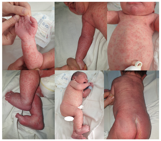 The first case involves a full-term male newborn (39 gestational weeks) with a birth weight of 3600 g. The infant was delivered vaginally, in cranial presentation, and received an Apgar score of 10 at 1 min in a level I maternity hospital. The pregnancy progressed physiologically without any interventions or treatment. Approximately a week before delivery, the mother experienced leucorrhea and genital itching, untreated. Rupture of the amniotic membrane occurred during birth. At birth, the infant presented with a diffuse, generalized erythematous maculopapular rash and rare pustules, including on the palms and the soles; fewer lesions were noted on the posterior trunk and the extension surfaces of the legs; the buttocks, penis, scrotum, and perianal were spared (Figure 1); and no oral lesions were found. Staphylococcal maternal–fetal infection, abdominal tumor, and congenital heart defect were suspected, and the infant was transferred to our hospital after a few summary investigations.