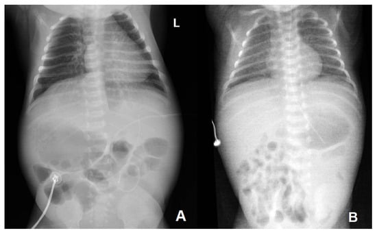 Abdominal ultrasound revealed mirrored abdominal organs, suggesting incomplete abdominal situs inversus, confirmed by the thoracoabdominal radiography (Figure 2A). The head ultrasound was normal; the echocardiography revealed the presence of a small patent ductus arteriosus, patent foramen ovale, and a right-sided aortic arch. Intravenous administration of antibiotics (Penicillin G, 75,000 IU/kg/day, divided in 2 doses, and Amikacin, 15 mg/kg/day, once daily), according to the unit’s protocol in suspected EOS cases, was initiated for three days as C-reactive protein decreased rapidly to normal values (from 19.4 mg/L), and the infant showed no other signs or symptoms of infection.