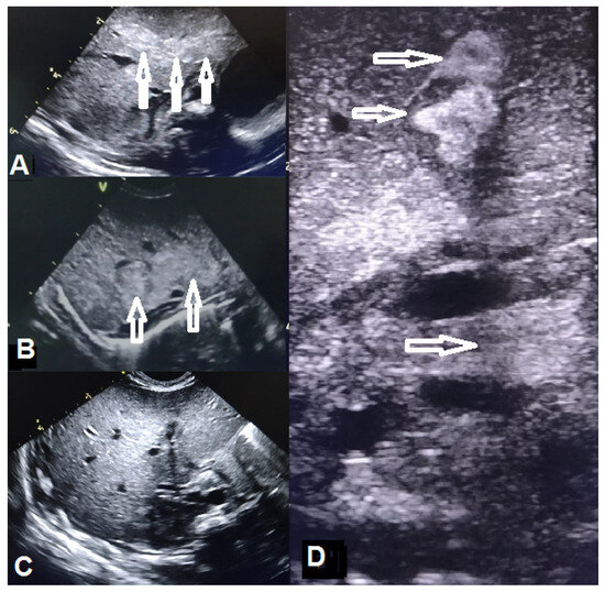 (A) Almost generalized gross, nodular, hyperechoic structure of the liver; (B,D) limited areas of fine granular echogenic hepatic structure; (C) fine, granular, normal sonographic aspect of the liver; arrows are indicating gross, nodular hyperechoic areas.