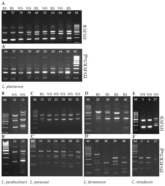 - Ferchichi, M.; Valcheva, R.; Prévost, H.; Onno, B.; Dousset, X. A One-Step Reaction for the Rapid Identification of Lactobacillus mindensis, Lactobacillus panis, Lactobacillus paralimentarius, Lactobacillus pontis and Lactobacillus frumenti Using Oligonucleotide Primers Designed from the 16S–23S rRNA Intergenic Sequences. J. Appl. Microbiol. 2008, 104, 1797–1807. [Google Scholar] [CrossRef] [PubMed]