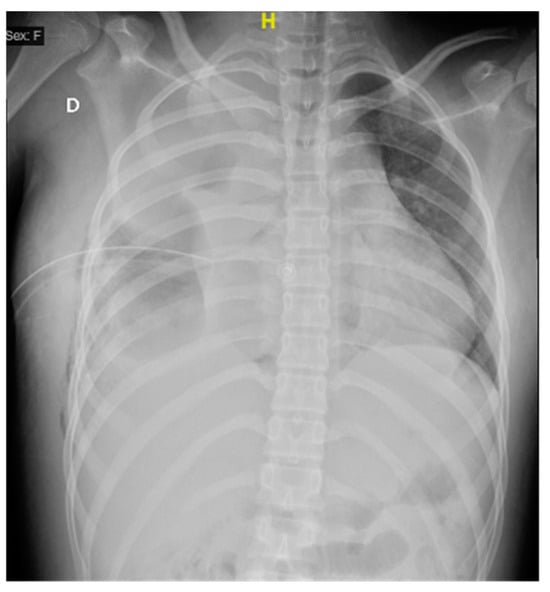 Upon admission to the emergency department of our hospital, she scored 15 on the Glasgow scale, requiring oxygen support with a face mask at 10 L/min, presented polypnea, the right hemithorax amplexation was decreased, and oxygen saturation of 89%. In addition, the right pleural tube showed 370 mL of hematopurulent output with a total of 128 mL (2.9 mL/kg/h) in 24 h. The gasometric study at the intake showed acid–base balance, hypoxemia, and normolactatemia (Figure 1).