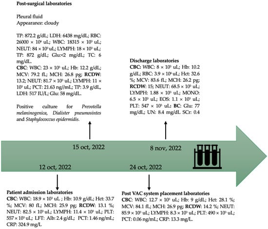 - Munguía-Canales, D.A.; Vargas-Mendoza, G.K.; Álvarez-Bestoff, G.; Calderón-Abbo, M.C. Management of Pleural Empyema with a Vacuum-Assisted Closure Device and Reconstruction of Open Thoracic Window in a Patient with Liver Cirrhosis. Arch. Bronconeumol. 2013, 49, 447–449. [Google Scholar] [CrossRef] [PubMed]