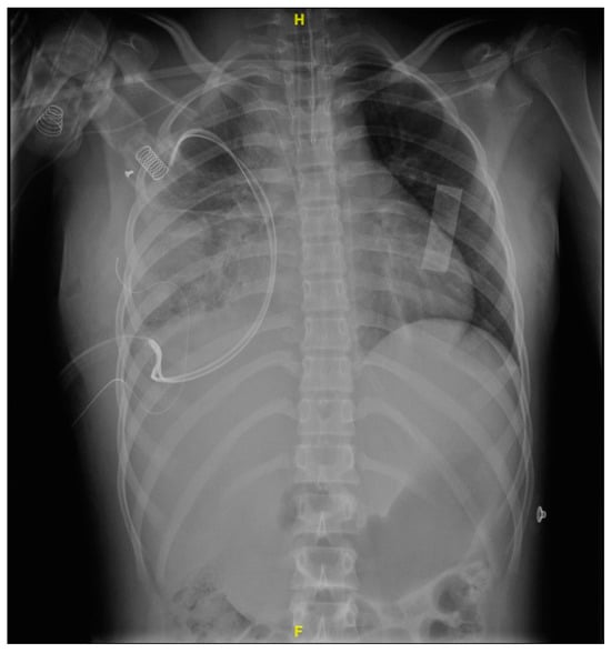 Anteroposterior thoracic X-ray taken on admission shows a right pleural tube and right pleural effusion with loss of the costophrenic angle and radiopacity in the right lung.