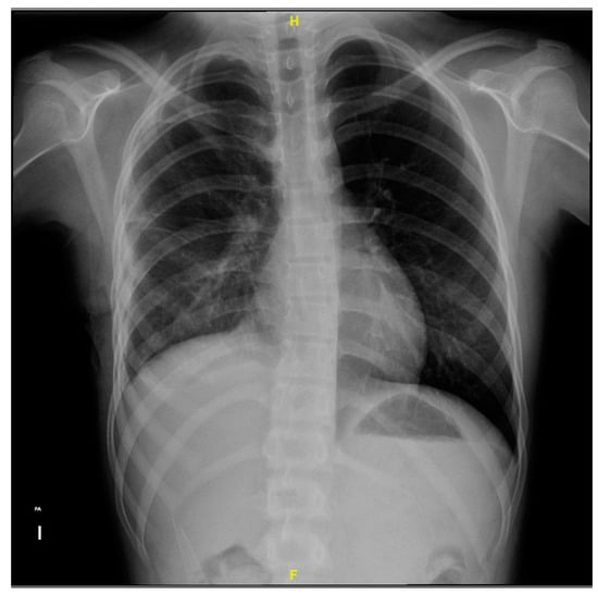 Approximately 40% of pneumonia in children present transudates, which can cover 10% of the pleura. Of these, 1–2% can be complicated due to exudative effusion, causing empyema [,]. Empyema necessitatis is more frequent in adults and immunosuppressed patients. It is a relatively rare entity in the pediatric population, with children under five years of age being the most susceptible, as with most infections [,].