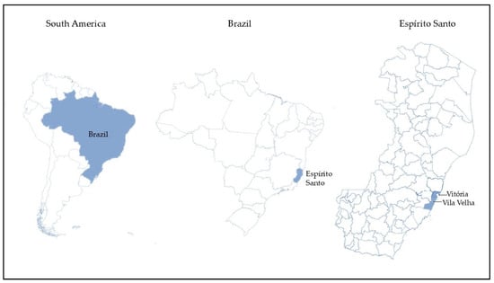 Map of the area where samples of coconut water were acquired during the year 2023 for microbiological analysis. Samples from the municipalities of Vila Velha and Vitória are included. These municipalities are part of the Vitória Region (the capital city’s macroregion), located in the state of Espírito Santo, Brazil.