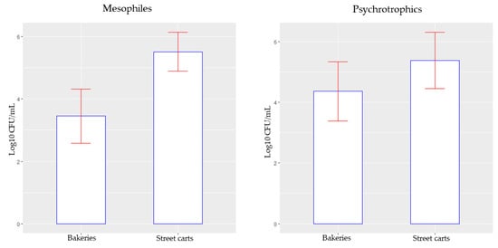 The t-test revealed a statistically significant difference (p = 0.0002462) between the mean counts of mesophilic aerobic microorganisms in samples from street carts with cooling coils (5.515 log10 CFU/mL) compared to those from bakeries (3.453 log10 CFU/mL). In contrast, there was no significant difference (p = 0.1198) in the mean counts of psychrotrophic microorganisms between street carts (5.373 log10 CFU/mL) and bakeries (4.362 log10 CFU/mL) (Figure 4).
