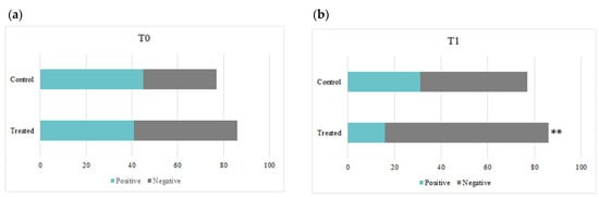 The graphs represent a comparison of HPV positivity between the control and treatment groups at baseline (T0) and after treatment (T1). (a) At T0, both the control and treatment groups showed similar levels of HPV positivity. (b) After 3 months of treatment (T1), the treatment group showed a significant decrease in HPV positivity compared to the control group (** p < 0.01).