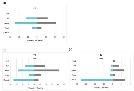 The graphs represent a comparison of cervical lesions in the control and treatment groups at baseline (T0), after 3 months (T1), and at 6 months (T2). At baseline (T0), both control and treatment groups showed similar cytology of cervical lesions (a). After 3 months of treatment (T1) and 6 months (T2) (b,c), the treatment group showed a significant improvement in cervical lesions (*** p < 0.0001 and **** p < 0.00001).