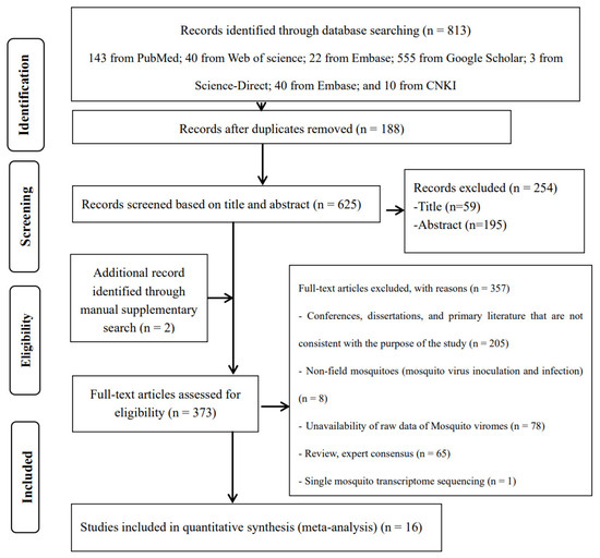 This systematic review and meta-analysis was conducted according to the Preferred Reporting Items for Systematic Reviews and Meta-analyses (PRISMA) 2020 Checklist [30]. A protocol was developed but was not uploaded to PROSPERO. The study focused on original research concerning mosquito viromes in mosquito pools, with a clear description of meta-viromic sequencing. Inclusion criteria encompassed (a) original research on mosquito viromes; (b) clear high-throughput sequencing methodology; (c) field-collected mosquitoes; (d) specific values for raw data reads provided in the included primary literature; and (e) specific values for viral sequence reads available in the original literature, either directly (in the text) or indirectly (in the Supplementary Materials). Specific values of raw data are the paired-end reads generated after post-library sequencing that have not been analyzed by the bioinformatics pipeline. In each of the included primary studies, the specific values of raw data are the total reads. Exclusion criteria included (a) meta-viromic studies of individual mosquitoes; (b) virological data from virus inoculation and infection in mosquitoes; (c) exclusion of RNA library construction sequencing; (d) the types of primary literature (reviews, commentaries, and conference papers); and (e) sequencing data obtained from databases rather than from the authors through high-throughput sequencing and first publication.