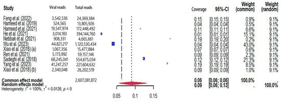 Based on the characteristics of the data included in this study, the raw values of coverage (ratio of virus reads to total reads) were subjected to Freeman–Tukey double-arcsine transformation and thus met the normality test, and the random effects model was finally selected for the pooled analysis of coverage based on the results of the heterogeneity test. Meanwhile, given the significant variations in sample size, study design, species sampling location, climate type, and sampling time across studies, a random effects model was similarly required for the analysis [35]. This model was utilized to aggregate the coverage of mosquito viromes, with the assessment of heterogeneity among studies conducted using the Chi-squared test (Q test) and I-square statistic. Subgroup analysis was performed to elucidate the impact of potential explanatory factors, such as pre-treatment of mosquito samples (prior to RNA extraction), host genome removal (before RNA library construction), bioinformatics pipeline (database), sequencing read-length, climate types, and region (continents). Subgroup variables were categorized into saline buffer or medium, saline buffer or medium plus antibiotics, and no saline buffer/medium/antibiotics based on how the mosquito samples were pre-treated. Based on the characteristics of the original literature ultimately included, we divided the geographic regions based on continental level into Asia, the Americas (South and North America), and Europe.