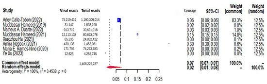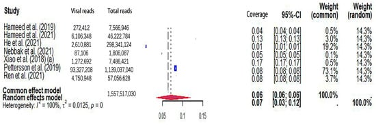 The bioinformatics pipelines utilized in the subgroup analysis of Culex and Anopheles mosquitoes were found to be similar, leading to no distinct differentiation. However, the study’s outcomes highlighted that the bioinformatics pipelines did not contribute to the heterogeneity in the coverage of mosquito viromes observed through meta-viromic sequencing, encompassing mixed genera and Aedes mosquitoes. Additionally, we delved into the subgroup variable “sequencing read-length” by examining the virome coverage in Aedes mosquitoes, revealing no statistically significant differences. This lack of disparity could be attributed to the varying construction methodologies of genomic libraries across different next-generation platforms [40,41,51,52]. Nevertheless, the overarching objective remains consistent: to procure high-quality sequences of the appropriate size for sequencing and to derive precise comparative results through standardized procedures [60].