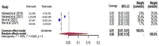 The viral coverage of mosquito viromes in pools of Anopheles (genus of mosquitoes). A total of 4 reported the viral coverage of mosquito viromes in mosquito pools of Anopheles [42,44,45,50].