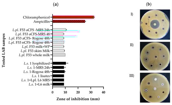 (a) Antagonistic activity of metabiotics of pre-selected lactobacilli against Staphylococcus aureus NCTC 6571, by the agar-well diffusion method. (b) Illustration of the inhibition zones obtained with ampicillin (10 μg/disc) as a positive control (I), tested CFS (II); and tested fermented milk, lyophilized CFS, and postbiotics (III). The antibacterial effects of the tested metabiotics (aCFS-acid, nCFS neutralized, and lysates) were expressed in mm diameter of inhibitory zones (with a well diameter of 6 mm). Two positive controls were used: the antibiotics chloramphenicol (30 μg/disc) and ampicillin (10 μg/disc) (BulBio, Sofia, Bulgaria)—the red bars. Gray bars show inhibition zones (mm) for samples derived from L.pl. F53 and the black bars—inhibition zones (mm) for samples derived from L.s. 1.