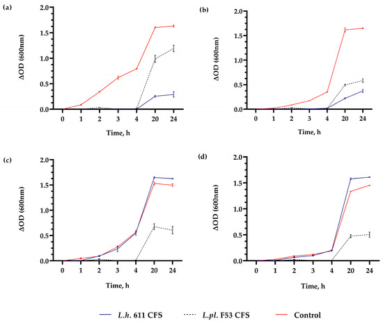 In addition to the agar-well diffusion assay, a spectrophotometric assessment of the pathogens’ growth inhibition by L. helveticus 611 and L. plantarum F53 was carried out (Figure 2). The spent CFS from L. plantarum F53, added to the BHI broth (10% v/v), significantly inhibited the growth of four selected test pathogens (Figure 2). In the presence of postbiotics, pathogens showed a prolonged lag phase and a retarded exponential growth phase. However, growth inhibition was not observed when CFS from L.h. 611 was added. With variants of the agar-diffusion method (Figure 1) and the spectrophotometric monitoring of the growth inhibition of four pathogens (Figure 2), the spectrum of activity against Gram (+) and Gram (−) bacteria was estimated. We assessed the activity of L. salivarius 1 and L. plantarum F53 in various forms (cell lysates, lyophilized form, milk, etc.) toward S. aureus (Figure 1), which have practical significance as well-targeting postbiotics. Considering the wide range of produced metabolites that contribute to the antimicrobial ability of Lactobacillus spp., such as organic acids, ethanol, diacetyl, carbon dioxide, hydrogen peroxide, and BLIS/bacteriocins [41,42], additional tests are needed to characterize which of them are synthesized by the tested lactobacilli. The production of bacteriocins/H2O2 and other inhibitory metabolites is a strain-dependent feature and requires strain-level rather than species-level screening.