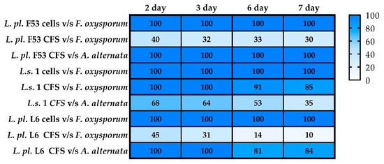In vitro evaluation of the antifungal activity of LAB cells (by mono- or two-layer methods) and 10% v/v CFS of Lactobacillus cultures in MRS broth, expressed as % inhibition against the control (tested fungal strains: F. oxysporum spp.; Alternaria spp.). All samples were tested in triplicate and subjected to statistical analyses using one-way ANOVA followed by Tukey’s post hoc test; p < 0.001.