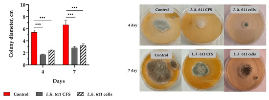 In vitro inhibitory activity against A. fumigatus strain 3-2 of CFS and exponential cultures of strain L.h. 611 in MRS broth inoculated in PDA agar plates (10% v/v). The monolayer method with PDA and a control containing 10% v/v MRS broth (pH 4.5) were used. The data from triplicate tests (mean ± SD) were subjected to statistical analyses, and the differences between samples and control were assessed using one-way ANOVA followed by Tukey’s post hoc test (*** p < 0.001).