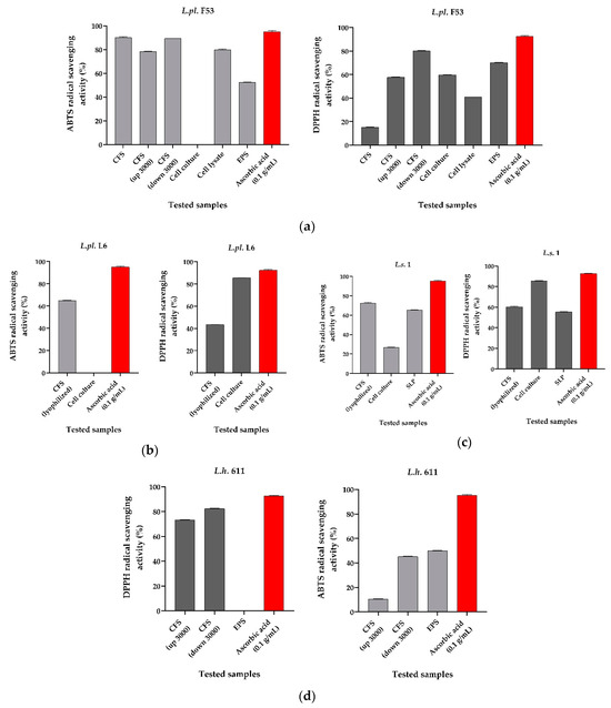 The DPPH and ABTS radical scavenging activity of metabiotics from tested LAB strains: (a) L. plantarum F53; (b) L. plantarum L6; (c) L. salivarius 1; (d) L. helveticus 611. Ascorbic acid (0.1 g/mL) was used as a positive control. All experiments were performed in triplicate to ensure reproducibility and accuracy, and the average values were used for analysis. The data are presented as mean ± SD for each group (n = 3); p-values were calculated using one-way ANOVA followed by Tukey’s post hoc test in comparison to ascorbic acid (p < 0.001). Legend: red bars—positive control used (ascorbic acid) in the both variants of assay; gray bars—samples tested by ABTS method; dark grey bars—samples tested by DPPH method.
