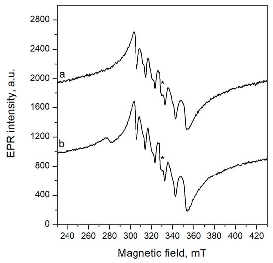 EPR spectra of lyophilized samples simulating real probiotic powder from (a) L. salivarius 1 and (b) L. plantarum L6. Legend: The asterisk denotes the signal with a g factor of 2.0012 ± 0.0005.