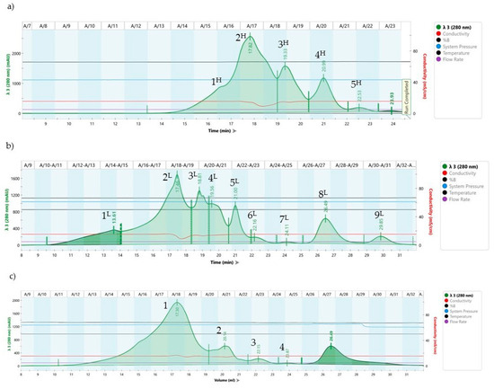 Results from FPLC chromatographic analysis, presenting SEC profiles of filtered CFS of both tested Lactobacillus cultures in MRS broth (pH 6.5), on a Superdex Peptide 10/300 GL columns (SEC 70kDA and SEC 650 kDa CFS) as follows: (a) CFS of L. helveticus 611 at SEC by 650 kDA; (b) CFS of L. helveticus 611 by SEC 70 kDA, and (c) CFS of L. plantarum F53 by SEC 70 kDA. Legend: The fractions are numbered in the order of their manual collection. CFS peaks of L.h 611 collected from SEC 70 kDA are designated L (as low) or H (as high) from SEC 650kDA respectively.