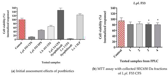 MTT assay to establish inhibitory effects on the K562 cells of (a) postbiotics; (b) SEC650 Da fractions of L.pl. F53 CFS; (c) L.h. 611 CFS; and (d) SEC70 Da fractions of L.h. 611 CFS, collected from FPLC analysis. The postbiotics and fractions of CFS were supplemented (4% v/v) to the cells in RPMI. The controls used are K562 cells in RPMI media inoculated with 4% v/v MRS, pH 6.5 (a) and 4% v/v elution buffer (b–d)—the red bars The data from eight replicates (mean ± SD) were subjected to statistical analyses, and the differences between the samples and control were assessed using one-way ANOVA followed by Tukey’s post hoc test (* p < 0.05; *** p < 0.001). All results from (a) show p < 0.001.