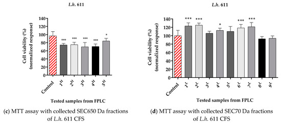 The initial calibration of the column with protein markers/standards was in a wide range to allow the determination of low and high molecular mass fractions. Sample CFS, L.h. 611, was evaluated on both columns and showed better separation of SEC 70 kDa. A difference in the chromatographic profile of the two strains is well illustrated with presented profiles from low molecular weight gel filtration column analysis (Figure 7a,b). All fractions from CFS of L. helveticus 611, marked with numbers and a superscript suffix H for Colum SEC 650 and with L for Sec 70, respectively, were collected manually. The nine peaks in the range from ~70,000 Da to ~500 Da were stored at −20 °C prior to following MTT analysis. On the chromatogram for L.pl. F53 CFS (Figure 7c), four peaks in the range of approximately 2 kDa to 0.05 kDa are clearly detected, with the high molecular weight column SEC 650.