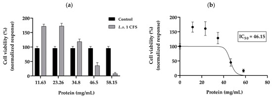 In our study, K562 cells were treated with different protein concentrations of L.s. 1 CFS (between 11.6 and 58.1 mg/mL protein) for 72 h, and the MTT assay was carried out to determine the effects of postbiotics on viability (Figure 9a). At 46.15 mg/mL of the CFS L.s. 1 treatment, 50% cell growth inhibition was achieved (IC50). Concentrations of L.s. 1 at 58 mg/mL and above led to 80–90% cell growth inhibition. In contrast, concentrations one-, two-, and four-fold lower than IC50 of L.s. 1 (34.8 mg/mL, 23.26 mg/mL, 11.63 mg/mL, respectively), exerted a stimulatory effect over the treated K562 cells that reached 166% growth compared to the respective control at 11.63 mg/mL. The IC50 value was 46.15 mg/mL (Figure 9b).