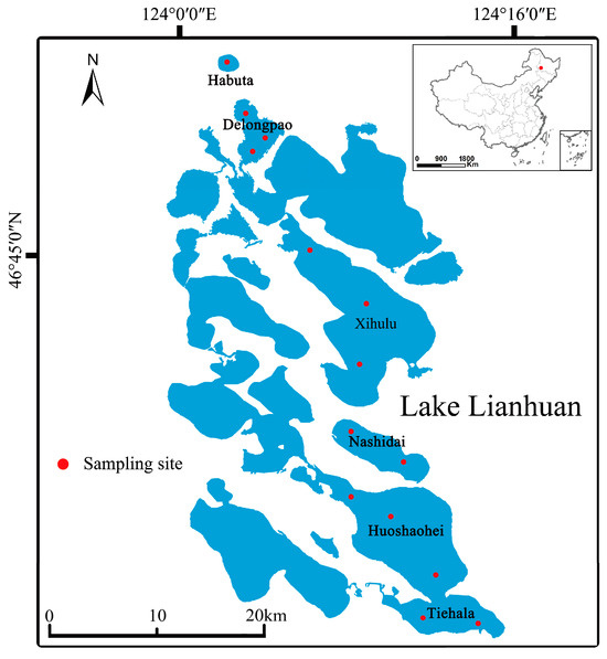 This study focuses on six small lakes located in the low-lying center of the Songnen Plain in northeastern China. These lakes have an average depth of 2.14 m and a maximum depth of 4.6 m, with a surface area of 580 km2. Rapid economic and technological development has significantly increased agricultural activities around the Lianhuan Lakes. Consequently, pollutants such as fertilizers and animal waste from these activities are discharged directly into the lakes via surface runoff, without undergoing any treatment. This study evaluated six lakes within the Lianhuan Lake system: Habuta, Delongpao, Xihulu, Nashidai, Huoshaohei, and Tiehala. These lakes represent major water bodies in the upper, middle, and lower reaches of Lianhuan Lake and were selected to assess the effects of environmental variables on microorganisms. The lakes have different natural morphologies and exhibit distinct characteristics. They are interconnected and vary in their geographic locations within Lianhuan Lake.