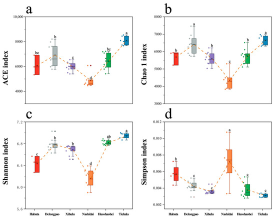 Boxplots with error bars showing the alpha diversity indices of bacterial communities in the sediments of Lianhuan Lake. (a) ACE index; (b) Chao1 index; (c) Shannon index; and (d) Simpson index. Lowercase letters indicate significant differences (p < 0.05) between sampling groups. Significant variations between experimental groups were identified via ANOVA followed by the Waller–Duncan post hoc test for pairwise comparisons.