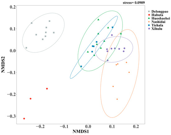 The bacterial community structures, including both unique and shared ASVs, were analyzed among the sediment samples from the six lakes. A total of 2275 ASVs were shared between all lakes. Delongpao Lake exhibited the highest number of unique ASVs (1246), followed by Xihulu Lake (319), Habuta Lake (281), Huoshaohei Lake (239), Tiehala Lake (154), and Nashidai Lake (145). NMDS analysis based on Bray–Curtis dissimilarity revealed significant differences in the beta diversity of sediment bacterial communities across the six lakes (Figure 3). The PERMANOVA results further confirmed these differences, showing significant variation in bacterial community structures between the lakes (PERMANOVA R2 = 0.67, p = 0.001), indicating that at least one lake has a markedly distinct bacterial community structure. Pairwise comparisons of the bacterial communities highlighted distinct compositions between specific lakes, with adjusted p-values confirming significant separations. However, no significant difference was observed between Huoshaohei Lake and Tiehala Lake (adjusted p-value = 0.063) (Table 3).