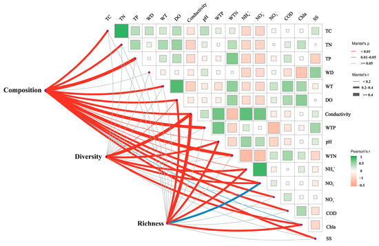 Mantel analysis illustrating the relationships between sediment bacterial community composition and alpha diversity with water and sediment physicochemical properties. The pink and blue lines indicate varying levels of correlation, while the gray lines represent no correlation. The thickness of the lines corresponds to Spearman’s correlation coefficients; thicker lines indicate stronger correlations, whereas thinner lines represent weaker correlations. TC: total carbon; TN: total nitrogen; TP: total phosphorus; WT: water temperature; DO: dissolved oxygen; Conductivity: electrical conductivity; pH: pondus hydrogenii; WTP: total phosphorus in water; WTN: total nitrogen in water; NH4+: ammonia nitrogen; NO3−: nitrate nitrogen; NO2−: nitrous nitrogen; COD: chemical oxygen demand; Chla: chlorophyll a; SS: suspended solids; Diversity: sediment microbial Shannon index; Richness: sediment microbial richness; Composition: microbial Bray–Curtis dissimilarity.