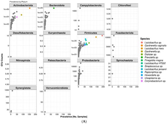 The study subjects were colonized by a total of 14 bacterial phyla representing 230 genera and 415 species. Firmicutes was the most abundant phylum representing 65.8% of the classified OTUs (Figure 1A). Within this phylum, Lactobacillus were the dominant genus, accounting for 62.7%. The remaining 3.1% of the Firmicutes phylum were represented by Streptococcus (1.7%), Megasphaera (0.6%), and other genera with less than 0.5% representation. Actinobacteriota was the second-most represented phylum (31.3%) with the Gardnerella-dominated genus accounting for 25.5%, Atopobium for 2.8% (now known as Fannyhessea for the vaginae species), Bifidobacterium for 1.8%, and Alloscardovia for 1.3% of classified OTUs. The remaining genera within the Actinobacteriota phylum accounted for less than 0.5% of classified OTUs. Other phyla such as Bacteroidota (1.8%) and Proteobacteria (0.83%) were poorly represented but together with Firmicutes and Actinobacteriota accounted for 99.73% of classified OTUs. The remaining 10 phyla colonizing the study subjects represented less than 0.3% of the classified OTUs.