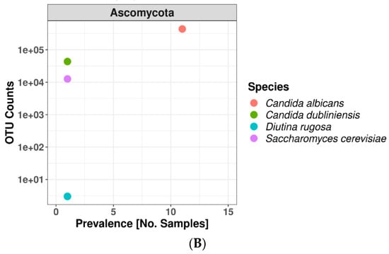 Bacterial taxa prevalence faceted by phylum in all 197 vaginal swabs (A) and fungal taxa prevalence grouped by Ascomycota phylum in 13 vaginal samples from 6 subjects (B). Prevalence is defined as the number of times a taxon is observed at least once in a sample (X axis). Colored bacterial circles represent species that were prevalent in at least 50 samples. Grey bacterial circles represent species that were prevalent in less than 50 samples.