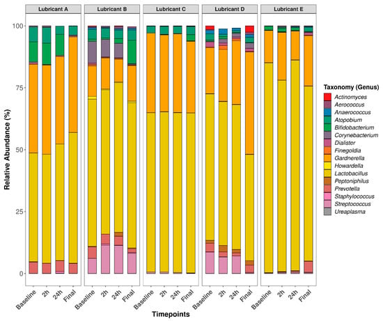 Poorly represented taxa, including those that were present fewer than three times in at least 20% of the samples, were removed for downstream visualization and statistical analyses yielding a total of 16 classified taxa. A beta-dispersion test was conducted between lubricant groups at baseline and between timepoints for each lubricant group, resulting in significant differences (p < 0.05) between lubricant groups only. This indicates that heterogeneity of variances was observed among lubricant groups, hence PERMANOVA assumptions were not met. Particularly, the baseline vaginal bacteriome variance from subjects enrolled into the lubricant E group differed significantly from subjects enrolled in lubricants A and B prior to lubricant application (Supplementary Table S5; Beta-dispersion test). Regardless of the beta-dispersion test outcome, it is worth noting that the goal of this study was not to compare bacteriome changes between lubricant groups but within lubricant groups across timepoints. Additionally, the beta-dispersion test was conducted to confirm whether lubricant groups should be considered in the PERMANOVA model. Therefore, lubricant effect across timepoints was assessed individually for each lubricant group via a within-subjects PERMANOVA test, hence avoiding permutation between subjects. As a result, no significant bacteriome differences at the genus level were observed between timepoints, for each lubricant group (p > 0.05). In addition, relative abundance changes from baseline were calculated for each individual bacterial taxon at the genus level and plotted as a function of timepoints. No significant changes from baseline were observed for each taxon post-lubricant application (p > 0.05), indicated by a generalized linear mixed model (GLMM) with binomial regression. Alpha-diversity measure (Shannon entropy) was categorized by lubricant type and timepoints without having significant changes (p > 0.05) between timepoints for each lubricant group, as revealed by a Kruskal–Wallis test (Figure S1). Taken together, lubricant use did not significantly alter the vaginal bacteriome at the genus level for up to 4 weeks post-lubricant application when measured by relative abundances and Shannon alpha diversity. Relative abundance of the most represented genera (Figure 2) and classified species (Figure S2) are illustrated in bar plots as a function of timepoints and faceted by treatment groups. Relative abundance changes from baseline are provided in Supplementary Figure S4.