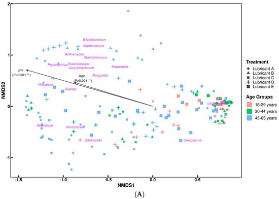 To assess whether overall species diversity (Shannon entropy) differed significantly between age groups and menopausal status, a Kruskal–Wallis test was implemented at the baseline. No changes in alpha diversity were observed between 18–29- and 30–44-year-old subjects, only between these two and the group aged 45–65 years with p < 0.05, indicating a higher bacterial diversity in the older population of female subjects (Figure S3). These differences in bacterial diversity were also observed when assessing the dissimilarities between the age group communities through beta-diversity measures (i.e., how microbial assemblages change along environmental gradients). The resulting NMDS ordination highlighted gradual bacterial community changes from groups aged 18–29 to 45–65 years with some overlap between groups (Figure 4A). This was further confirmed by an analysis of similarities test between age group communities (R = 0.2, p < 0.01), where the low R value indicates some dissimilarities between groups with high overlap of bacterial composition.
