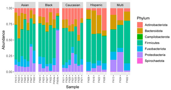 Firmicutes and Bacteroidota phyla dominate the healthy human oral cavity and other locations such as the human gut [42,43]. In fact, the five most common phyla documented in this study have been consistently found as the most common in studies for some time [44,45]. Although likely a true finding, one of the reasons these phyla continue to be common may be due to database biases [46]. Firmicutes and Bacteroidota have been postulated to be part of an alliance against the detrimental genera within the Actinobacteria phyla, thus protecting the overgrowth of opportunistic pathogens [47]. Many Fusobacteria, like Firmicutes and Bacteroidota, are considered to be symbiotic within the human oral cavity [48]. Proteobacteria presence is known to be a signature of dysbiosis within the human gut [49], but their role within the oral cavity is less clear.
