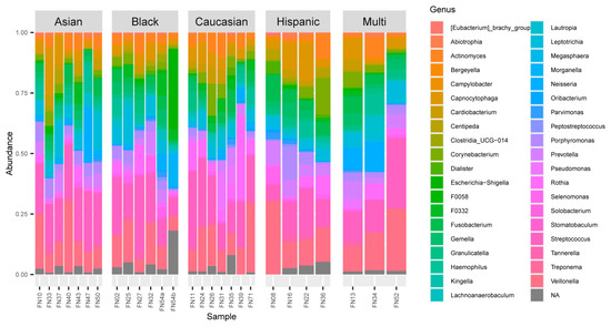The most common phyla found across samples were Firmicutes (46.7%), Bacteroidota (15.2%), Actinobacteriota (14.9%), Proteobacteria (13.1%), and Fusobacteriota (9.5%). The distribution of these phyla across all samples (all sites combined for each individual) can be seen in Figure 1. The top abundance within genera for samples included Streptococcus (18.1%), Veillonella (14.1%), Capnocytophaga (5.4%), and Leptotrichia (5.2%), followed by Prevotella and Fusobacterium (both 4.2%). The distribution of these genera across all samples (all sites combined for each individual) can be seen in Figure 2.