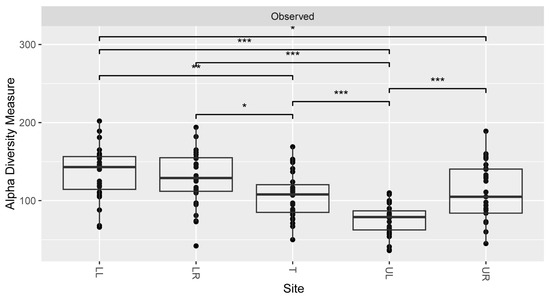 Alpha diversity bar plot reflecting the total observed unique OTUs across each of the five sampling locations (LL—lower left, LR—lower right, T—tongue, UL—upper left, UR—upper right). Significance values were documented (* p < 0.05; ** p < 0.01; *** p < 0.001) and all samples were rarefied to 10,000 reads.