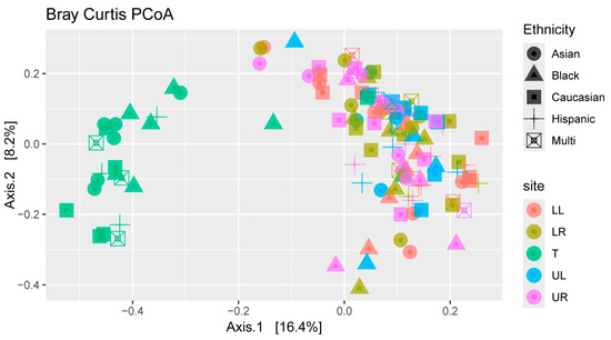 Beta diversity plot reflecting weighted Bray–Curtis principal coordinate analyses involving samples rarefied to 10,000 reads. Each point is associated with a single sample, with the shape indicating ethnicity and the color indicating sampling location (LL—lower left, LR—lower right, T—tongue, UL—upper left, UR—upper right).