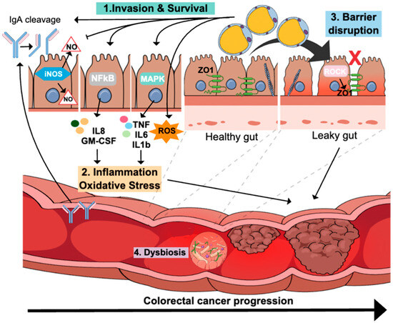 Possible mechanisms through which Blastocystis can promote CRC. (1) Invasion of and survival in the host by targeting the immune responses through the degradation of IgA and suppression of antimicrobial products, iNOS. (2) Blastocystis infection induces an infection-mediated inflammation by stimulating the release of inflammatory cytokines, mainly IL-8, TNF-α, IL-6, and IL-1β, and oxidative stress that promotes gut leakiness and stimulates the oncogenesis pathways. (3) Blastocystis disrupts the intestinal barrier inducing a leaky gut by targeting ZO-1 protein. (4) Blastocystis infection causes gut microbial dysbiosis.